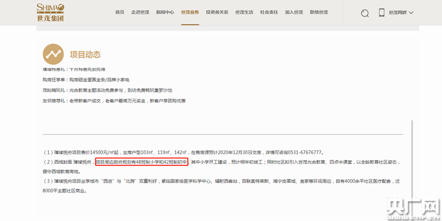 記者檢索發現,在世茂集團官方網站上關于該樓盤的介紹中,確有顯示“璀璨悅府,項目周邊政府規劃有48班制小學和42班制初中,其中小學開工建設,預計明年初竣工;同時社區擬引入世茂光合教育、四點半課堂,以全齡教育社區姿態,據守西城教育高地”的相關信息。