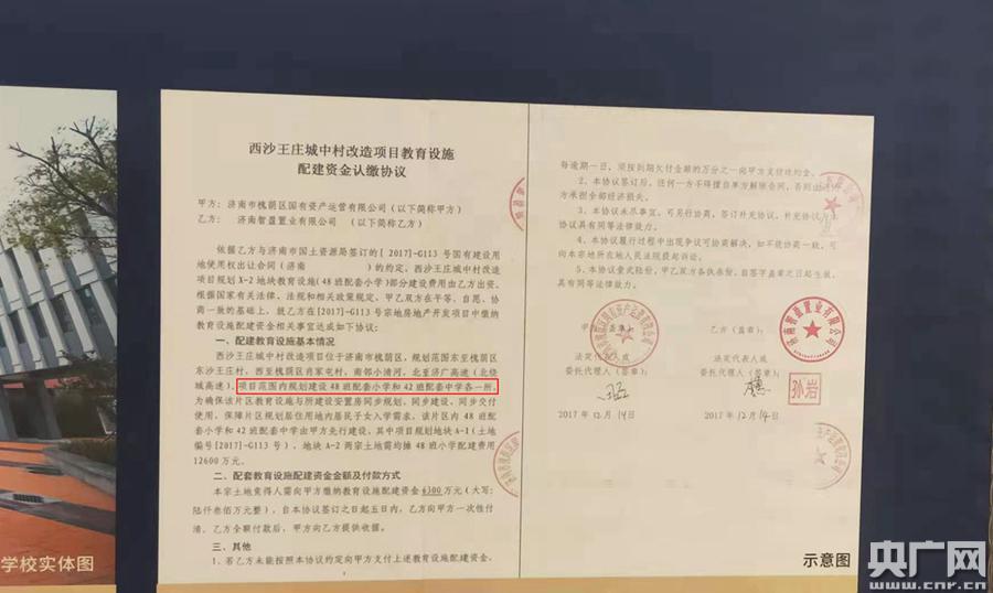 根據業主提供的《西沙王莊城中村改造項目教育設施配建資金認繳協議》顯示,配建資金認繳協議的乙方正是世茂璀璨悅府的開發商濟南智盈置業有限公司。認繳協議中明確,“項目范圍內規劃建設48班配套小學和42班配套中學各一所。為確保該片區教育設施與所建設安置房同步規劃、同步建設、同步交付使用,保障片區規劃居住用地內居民子女入學需求,該片區內48班配套小學和42班配套中學由甲方先行建設。”“本宗土地競得人需向甲方繳納教育設施配建資金6300萬元。”
