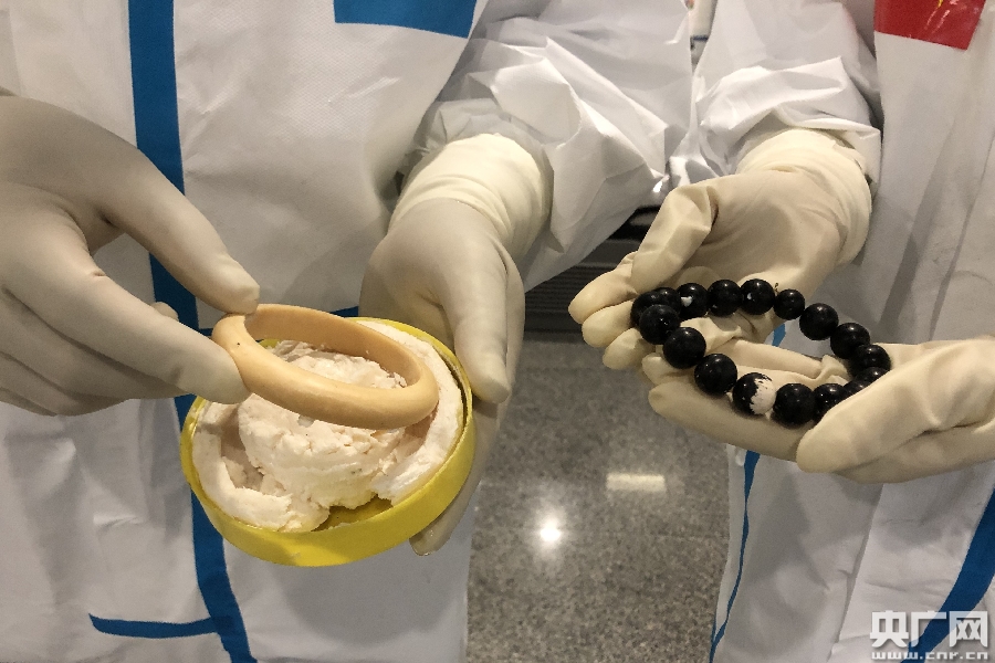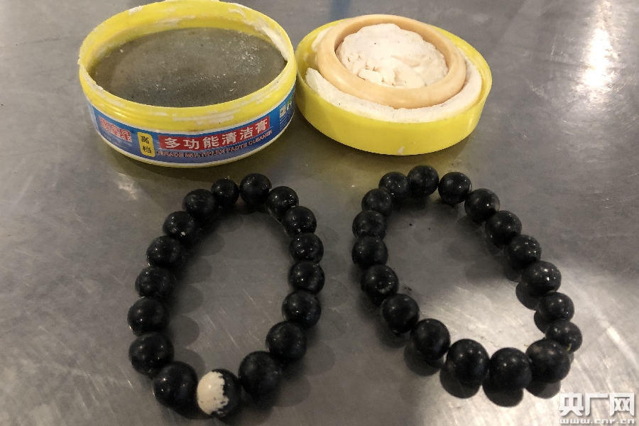 當日,現場關員在監管自開羅入境航班時,發現一名旅客的托運行李機檢圖像存在異常。經開箱查驗,發現2件黑色手串,旅客自述為非洲黑木手串,但質感、顏色與常見木制手串存在差異。現場關員用刀輕刮手串表面,發現外層是黑色涂料,內見乳白色質地,從紋理判斷疑似象牙制品。在對該旅客所有行李物品進行徹底查驗后,又在一個多功能清潔膏盒子中查獲嵌在膏體中的疑似象牙手鐲1件。經清點,該旅客共攜帶疑似象牙制品3件,重140克,其自述這些手鐲、手串是帶回國送給孩子的結婚禮物。隨后,現場關員又從同機另4名旅客托運行李中查獲疑似象牙制品14件,重470克。