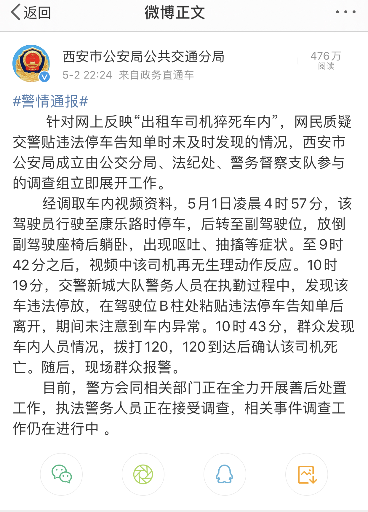 西安市公安局公共交通分局通報顯示,5月1日9時42分,張師傅在副駕駛座上徹底失去了生理動作反應,離開了人世。