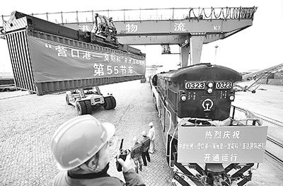 2014年10月18日,國內(nèi)第一個(gè)經(jīng)滿洲里口岸過境直達(dá)莫斯科的國際集裝箱班列,在遼寧營口港裝完55節(jié)車皮之后徐徐開出。