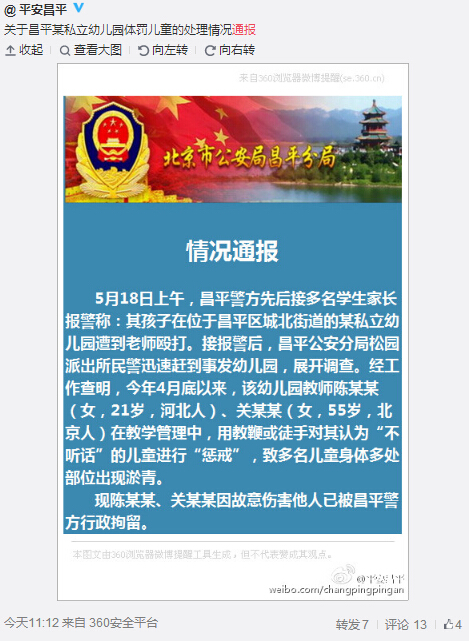 今日,北京市公安局昌平分局官方微博“平安昌平”發文公布調查結果稱,5月18日上午,昌平警方先后接多名學生家長報警稱,其孩子在位于昌平區城北街道的私立幼兒園遭到老師毆打。接報警后,昌平公安分局松園派出所民警迅速趕到事發幼兒園,展開調查。