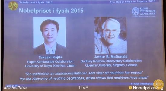 【環球網綜合報道】據諾貝爾獎官網的最新消息,瑞典斯德哥爾摩當地時間6日中午11時45分,2015年諾貝爾物理獎在當地的瑞典皇家科學學院揭曉,梶田隆章(Takaaki Kajita)和 阿瑟-麥克唐納(Arthur B. McDonald)榮獲該獎項。因二人發現中微子振蕩,這表明中微子有質量。