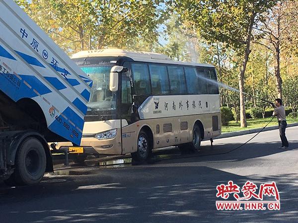 這輛車車牌號(hào)為豫AE0073的灑水車,車身上印有“中原環(huán)衛(wèi)”字樣。灑水車的尾部接出一根水管,一名男子拿著水槍向一輛大巴車噴水。旁邊還站著一名男子一邊抽著煙,一邊與洗車男子有說有笑。大巴車的車牌號(hào)為豫AP6021,車身上寫著“河南外事旅游”。