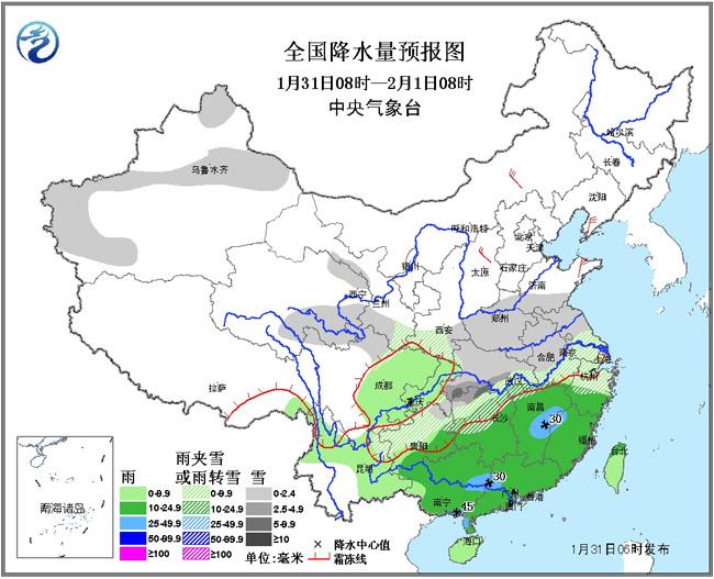 1月31日08時至2月1日08時,新疆北部和西南部、青海東部、陜西南部、甘肅南部、黃淮南部和西部、江淮、江漢、江南北部、貴州中北部等地有小到中雪或雨夾雪,局部有大雪;西南地區東部、云南東南部和北部、江南中南部、華南等地有小到中雨,其中,江西中部、廣西南部沿海和東北部、廣東西部等地的部分地區有大雨。臺灣海峽將有7~8級、陣風9~10級的大風。