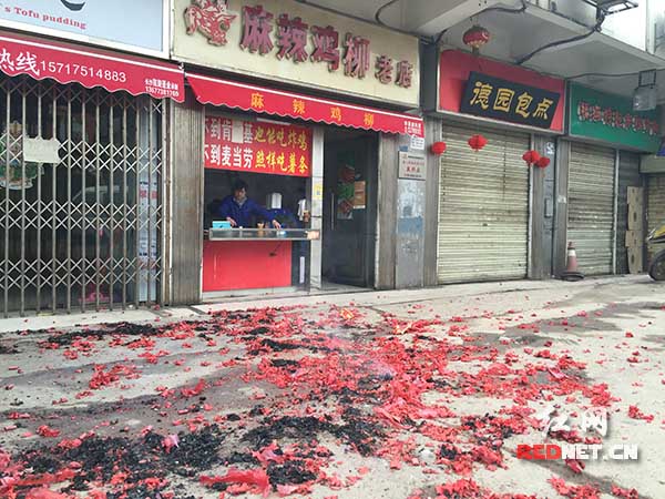 早上7點左右,可以聽到外面的鞭炮聲,到了8點,長沙城區的鞭炮聲幾乎一陣接一陣。記者經過車站南路、城南路、韶山南路一帶,看到街邊少數的店面已經開門營業,部分店面門口有燃放鞭炮,這些燃放鞭炮的店面主要集中在小型超市、汽修類門面、餐飲店、糖果副食品店等,有些店主選擇自己清掃后由環衛工人運走鞭炮垃圾。今天鞭炮燃放的時間集中在早上7-10點,截至10點,部分鞭炮灰已經清掃完畢。