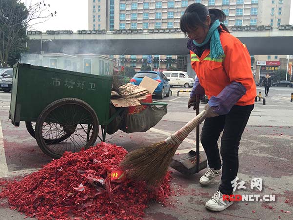 紅網長沙2月15日訊(時刻新聞記者 李慧)今天是大年初八,是商家的開張之日,在這一天很多商家會燃放鞭炮祈求新的一年生意紅火,而這樣的需求也成為長沙13789名環衛工人的辛苦日。僅雨花區高橋片區的鞭炮紙屑清理點便達405個,清掃任務加重。