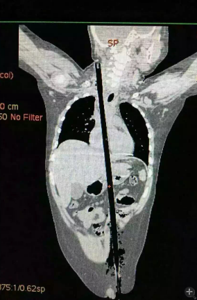 市兒童醫(yī)院組織專家團隊對孩子的病情進行檢查、評估后發(fā)現(xiàn),竹棍由患兒左側(cè)大腿根部插入,經(jīng)腹腔穿透胃、肝臟、膈肌入胸腔,并穿透患兒心臟,經(jīng)胸腔入頸部,此刻不能拔除竹棍,因為去除竹棍會導(dǎo)致心臟、肝臟破裂大出血導(dǎo)致休克,危及性命。