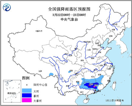 中國天氣網(wǎng)訊 中央氣象臺3月22日06時繼續(xù)發(fā)布暴雨藍(lán)色預(yù)警: