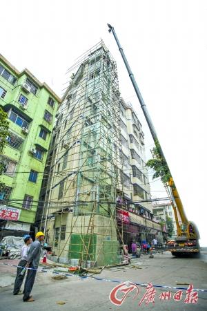 昨天下午,違建電梯正在拆除中。該建筑樓高7層,1~6樓已出租,7層是業(yè)主自住,一樓鐵門直通電梯門,電梯只停1樓和7樓。 廣州日報記者 蘇俊杰攝