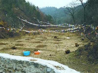 根據(jù)其他村民的指點,記者和王云芳在一處山溝里找到了放生點。這里的山溝中掛有大量彩色旗幟,有的旗幟上畫有圖案,有的上面寫有看不懂的文字。附近至少有15只狐貍和貉在四處游蕩,在吃人們投放的白面饅頭和胡蘿卜。