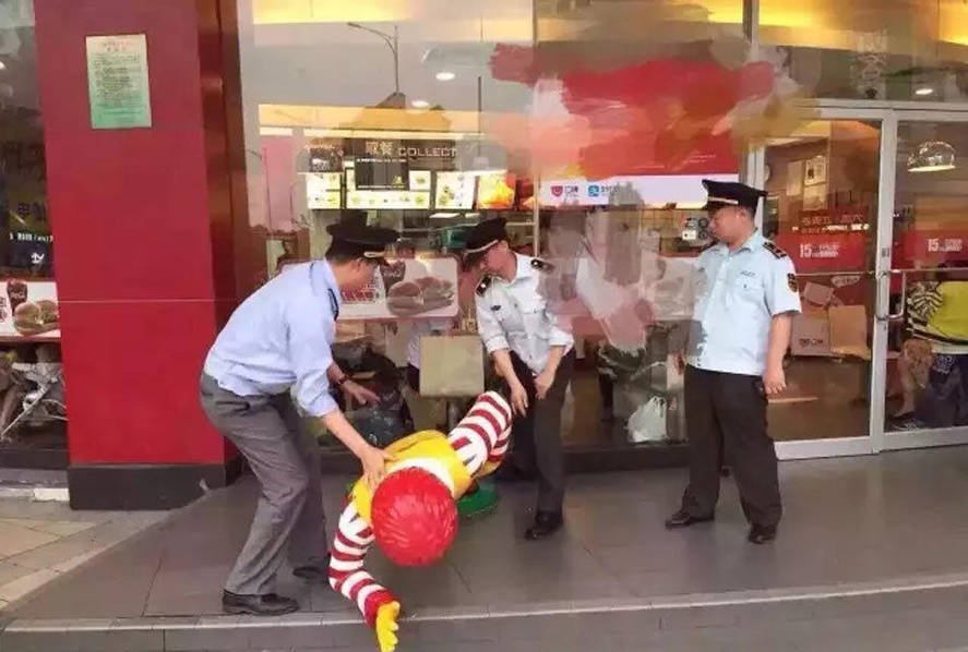 麥當勞叔叔被廣州城管“抓走” 鞋子都斷了