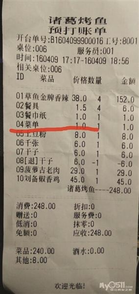4月9日,鎮江市民馬先生帶著家人和朋友來到了鎮江城區大市口解放路新開業的一家諸葛烤魚店,吃完結賬時,店家告知一共消費了248元,于是服務員向馬先生提供了一張賬單。細心的馬先生發現在收費單上,除了馬先生一家人消費的菜品、餐具以及餐巾紙的價格以外,第四項赫然寫著菜單的價格收費一元。馬先生告訴記者,因為商家并沒有提前告知菜單需要收費,所以結賬時感到有點意外,而且之前也從來沒有遇到過這樣的情況。為此,馬先生向服務員提出了異議,對方表示菜單要收費是老板定的,他們也沒有辦法?紤]到服務員是打工的,也不容易,之后也就沒多計較,菜單也并未帶走。因為有家人和朋友同行,為了不破壞氣氛,最終并未找老板詢問菜單要收費的緣由。
