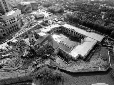星漢北路金府鋼材城內(nèi),一座20多米高的建筑矗立在大片綠地中,尤為醒目。這座建筑由大廳和鐘樓組成,都是紅頂黃墻,主體結(jié)構(gòu)全部完工。在它背后,還藏著一座占地面積近9000平方米的下沉式廣場,環(huán)形廊橋分上下兩層,中間留出空地。