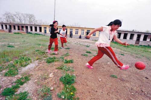 三名學(xué)生在校舍前的荒地上玩著“跳格子”游戲,游戲中投擲用的布口袋被隨手撿來(lái)的石塊替代。學(xué)生校服上的“蘇子峪小學(xué)”字樣是這個(gè)學(xué)校的唯一文字標(biāo)識(shí)。男孩名叫金恒宇,是這個(gè)學(xué)校和班級(jí)里唯一的男生。金恒宇玩起這原本不是男孩子的游戲時(shí),也顯得十分熟練。董思沂和張欣逸專注地看著金恒宇的每個(gè)動(dòng)作,如有違規(guī)就會(huì)被她倆中的一位替換下來(lái)。三人互為裁判,玩得認(rèn)真而開(kāi)心。游戲間,一位村民趕著幾十只山羊穿過(guò),學(xué)生們看上去儼然已經(jīng)習(xí)慣了這樣的場(chǎng)面。山羊在操場(chǎng)上還忙著啃上幾口青草,隨后被陸續(xù)趕進(jìn)隔壁荒廢的教室,山羊過(guò)后在草地上留下散落的“羊糞蛋”。