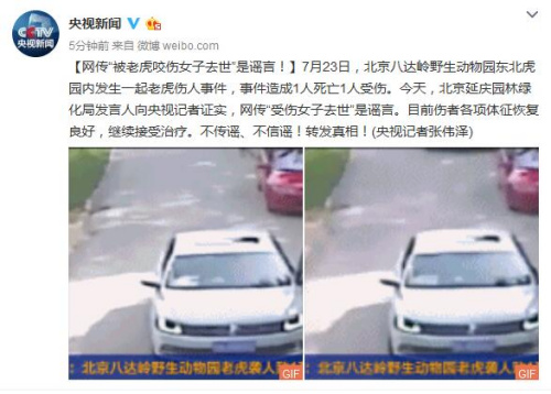 【網傳“被老虎咬傷女子去世”是謠言!】7月23日,北京八達嶺野生動物園東北虎園內發生一起老虎傷人事件,事件造成1人死亡1人受傷。今天,北京延慶園林綠化局發言人向央視記者證實,網傳“受傷女子去世”是謠言。目前傷者各項體征恢復良好,繼續接受治療。不傳謠、不信謠!轉發真相!(央視記者張偉澤)