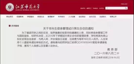 這條《關于本科生宿舍管理試行男女合住的通知》稱,從2016年下學期試行男女合住的管理政策,學校將首先泉山校區安排合住宿舍,為兩人間,并安裝獨立浴室,住宿費為每年1600元。