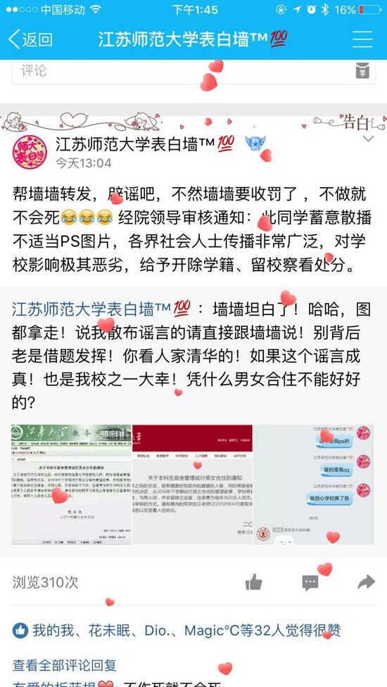 現代快報訊(記者 李偉豪)8月20日上午,一條截圖在微信朋友圈迅速傳開。截圖顯示是江蘇師范大學官網發布的一條通知,通知稱校方共2016年第二學期開始,可以申請男女合住。不過,很快,該校便通過官方微博辟謠,表示此為惡意造謠,保留追究造謠者發了責任的權利。