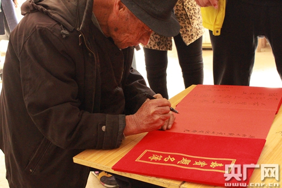 周明漢寫下對于淮北大鼓未來發(fā)展的希冀(央廣網(wǎng)記者 孫永政 攝)