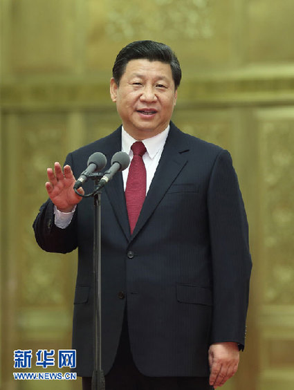 2014年1月6日,黨和國家領導人習近平、李克強、張德江、俞正聲、劉云山、王岐山、張高麗等在北京人民大會堂會見探月工程嫦娥三號任務參研參試人員代表。這是習近平發表重要講話。新華社記者 蘭紅光 攝