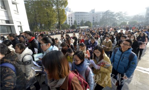考生們進場前還要“抱下佛腳”,不過考題的知識點跨度很大。新華報業視覺中心記者 邵丹 攝 2017國家公務員招錄筆試已正式開考,昨天是國考行測和申論考試的“大日子”,共有64124名考生選擇了江蘇考區參加國考。