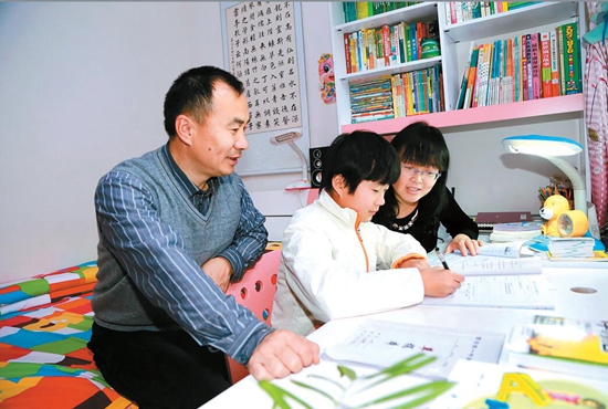 夫妻倆一起給女兒輔導(dǎo)功課 。