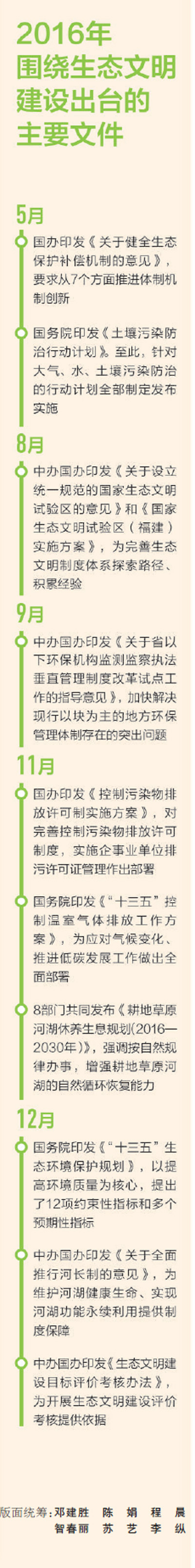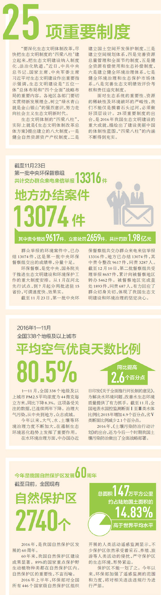 盤點2016年生態(tài)環(huán)保領域大事,令人振奮。從中央環(huán)保督察制度形成到省以下環(huán)保機構垂直管理試點,從國家生態(tài)文明試驗區(qū)試點到生態(tài)環(huán)境損害賠償制度試點,生態(tài)文明制度建設已經按下快進鍵,改革步伐加快,成果有目共睹。