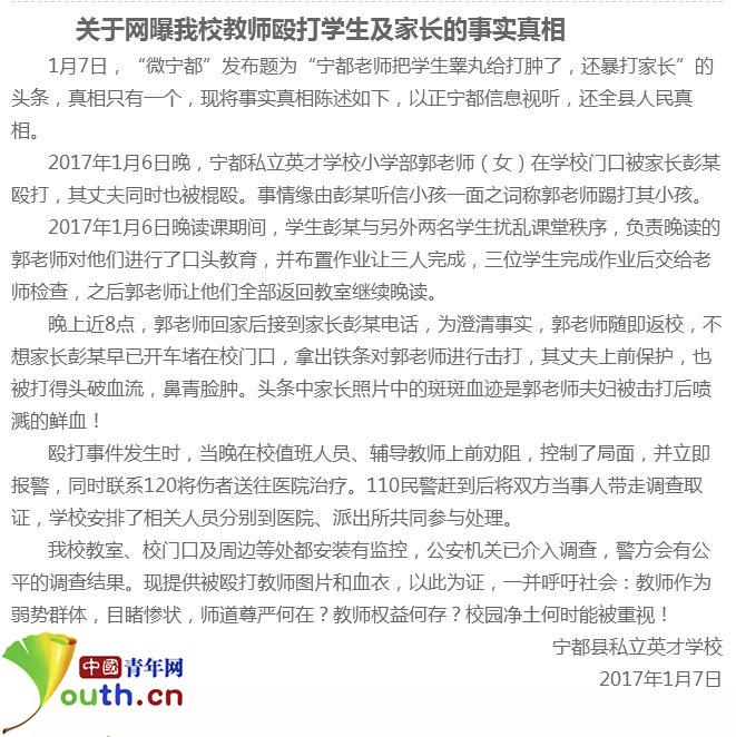 1月7日下午,中國青年網(wǎng)記者收到學(xué)校教師發(fā)來的情況說明《關(guān)于網(wǎng)曝我校教師毆打?qū)W生及家長的事實(shí)真相》。該說明同時(shí)在學(xué)校網(wǎng)站發(fā)布。其稱,1月6日晚讀課期間,學(xué)生彭某與另外兩名學(xué)生擾亂課堂秩序,負(fù)責(zé)晚讀的老師對其進(jìn)行口頭教育后布置作業(yè)讓三人完成。在三人完成作業(yè)后,老師讓三名學(xué)生返回教室繼續(xù)晚讀。