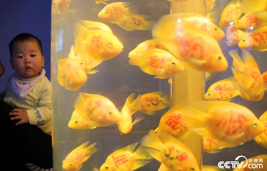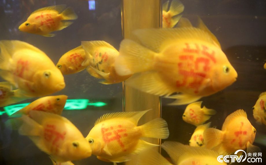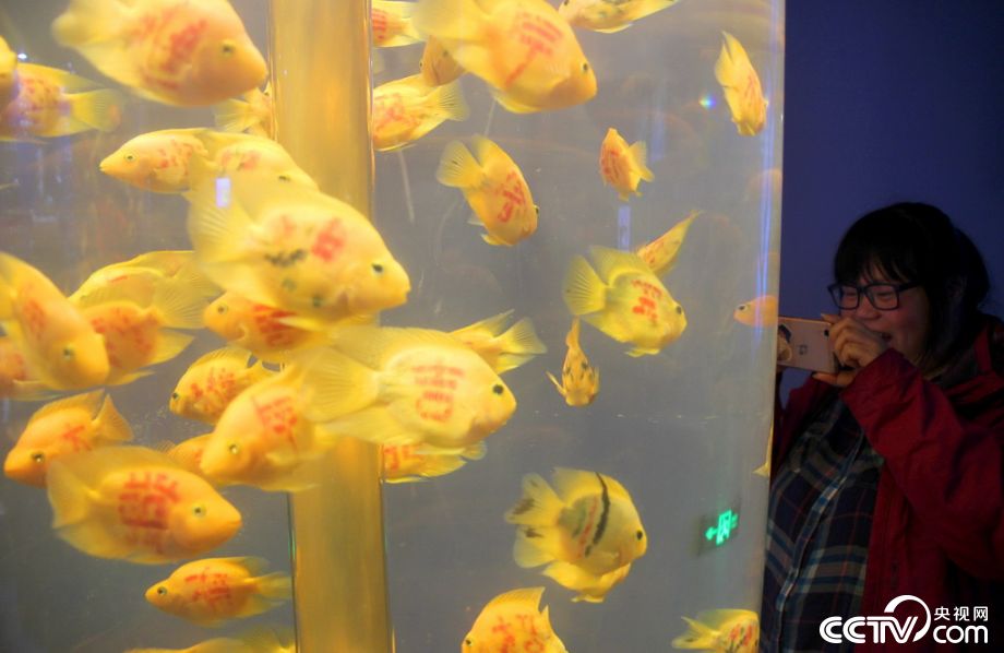 2017年1月8日,江蘇蘇州海洋館內一尾尾紋上了吉祥語及圖案的“紋身魚”在水族箱里格外漂亮,吸引了眾多參觀者的目光。據(jù)悉,這是用低強度激光紋在魚鱗上的,對魚沒有傷害,只要魚鱗不掉,圖案就不會消失。 視覺中國 -