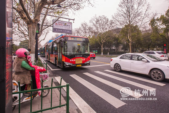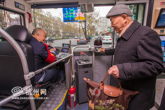 “上車時包放在前面,手機(jī)拿在手上,請把扶手扶好。”“請給老人、小孩等有需要的乘客讓個座。”“武林門站站到了,可以換乘290路、155路。”“大包行李請往后拿。”“下車時行李包不要忘記。”