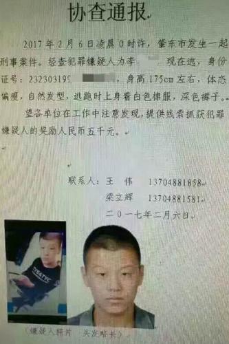 記者從警方了解到,雙方因打仗發生命案,嫌犯李某致一人身亡,一人重傷在哈市搶救。李某1995年出生,體態偏瘦,自然發型,逃跑時上穿白色棉服,深色褲子。目前,肇東警方正全力抓捕嫌犯中。