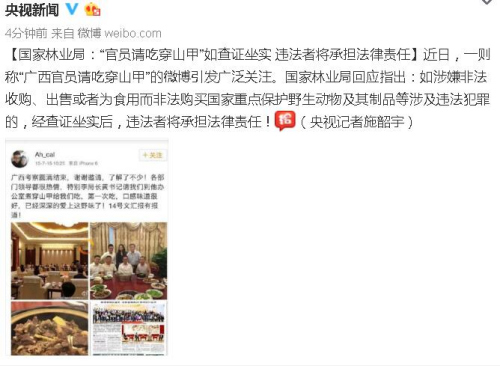 近日,一則稱“廣西官員請吃穿山甲”的微博引發廣泛關注。國家林業局回應指出:如涉嫌非法收購、出售或者為食用而非法購買國家重點保護野生動物及其制品等涉及違法犯罪的,經查證坐實后,違法者將承擔法律責任!(央視記者施韶宇)