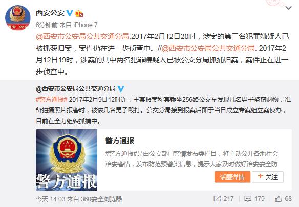 2月9日早上8時許,陜西一公車上少年大聲指認車上小偷組織,卻反遭對方一行人拉下車狂毆。西安市公安局公共交通分局今日表示,2月9日12時許接到報案,當日成立專案組。2月12日20時,涉案的第三名犯罪嫌疑人已被抓獲歸案。此前,西安市公安局通報稱,已有兩名嫌疑人落網。