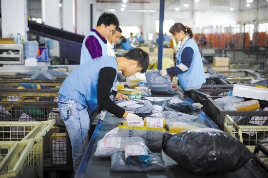 工作人員分配電子商務快遞包裹。(圖片來自網絡)