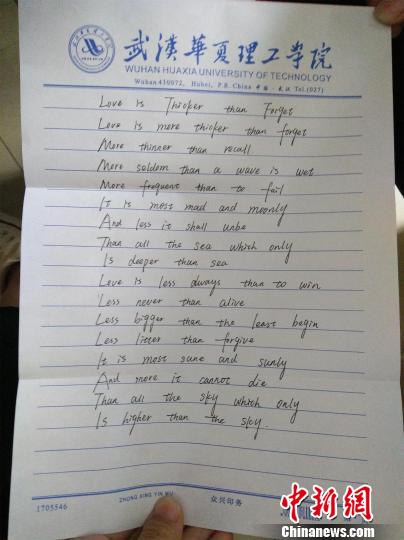 該男生名叫周鶴齡,為了寫(xiě)好這34份書(shū)信,他上網(wǎng)查找大量資料,還在圖書(shū)館翻閱書(shū)籍,花了3天時(shí)間完工。他說(shuō):“我在參考英文詩(shī)歌的基礎(chǔ)上再原創(chuàng),盡量嘗試用不同的方式去表達(dá),希望每一封信都能準(zhǔn)確地傳達(dá)出我的想法”。每封信件用信封裝著,英文字體清秀,字里行間流露出周鶴齡對(duì)女同學(xué)們的祝愿、祝福。