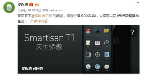 “我是‘錘友’,一直很關注羅永浩,之前問過一些比較正經的問題,但沒有答復。”這名網友告訴中新網(微信公眾號:cns2012)記者,后來考慮到,設計的問題要給羅永浩很大的發(fā)揮空間,又要引起圍觀者的興趣,所以才有了上面的問題。
