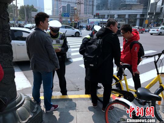 上海南京西路華山路路口,兩名交警對三名在機動車道騎行共享單車的人員進行處罰。 王子濤 攝