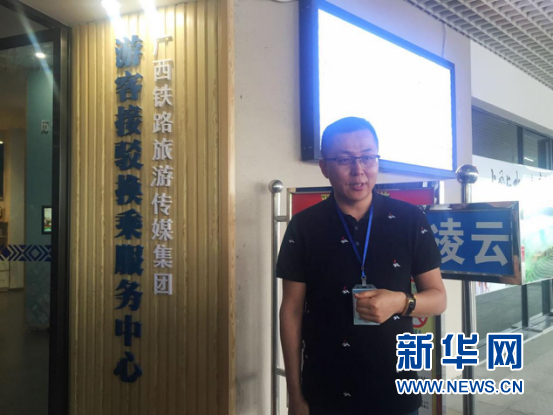 畢海斌在百色車站游客接駁換乘服務中心介紹高鐵無軌站相關情況。新華網 聶晨靜 攝