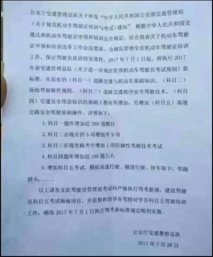 近來,在多地網(wǎng)民的微信、微博中都流傳著一則有關“機動車駕駛證培訓與考試”的“通知”。其中寫道:“2017年7月1日起,將執(zhí)行2017年省交通管理總隊(關于進一步規(guī)范管理機動車駕駛員考試規(guī)則)新標準!彪S后,“通知”上還列出了以下“新規(guī)”:“科目一題庫增加近260道題目;科目二由現(xiàn)有的5項增加至9項;科目三在現(xiàn)有路考中增加1項防御性駕駛技術(shù)考試;科目四題庫增加近100道題;增加科目五考試,模擬高速行駛、隧道行駛、停車取卡、窄路掉頭……”
