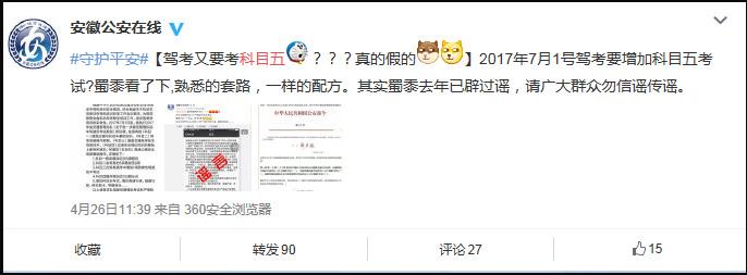 對此,山東、青海等多地交警部門均對此辟謠。4月27日,“長沙網(wǎng)警巡查執(zhí)法”也在其官方微博上稱:“據(jù)@湖南交警表示,《機動車駕駛證申領和使用規(guī)定》自2016年4月1日起施行后并未進行修改,機動車駕駛?cè)丝荚噧?nèi)容無變動,駕考增加科目五的消息為謠言!” 山西省交管局車管處工作人員也在日前接受媒體采訪時表示,“7月1日起駕考新增科目五”的說法純屬謠言。