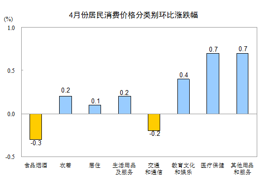 4月份,全國居民消費價格總水平環比上漲0.1%。其中,城市上漲0.1%,農村持平;食品價格下降0.6%,非食品價格上漲0.2%;消費品價格下降0.1%,服務價格上漲0.4%。