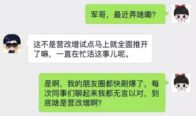 到今年5月1日,營改增試點全面推開已整整一年。一年來,營改增減稅效應如何?今后又如何深入推進這項改革?一無所知的小白又來請教稅務達人小軍了!一起看看他們又聊了啥?