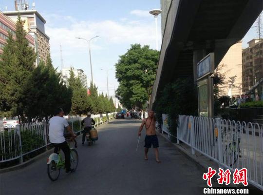 6月5日,記者從蘭州交警部門了解到,一男子酒后無照駕駛摩托車闖紅燈,不但不配合民警執法,反而持鐵棍暴力襲警。圖為男子持鐵棍行兇!〗痪块T提供 攝