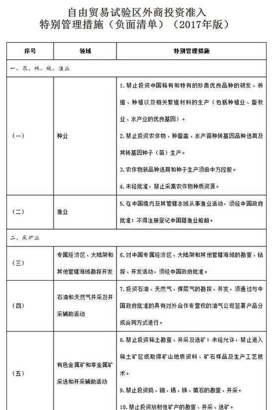 《自由貿(mào)易試驗區(qū)外商投資準(zhǔn)入特別管理措施(負面清單)(2017年版)》全文: