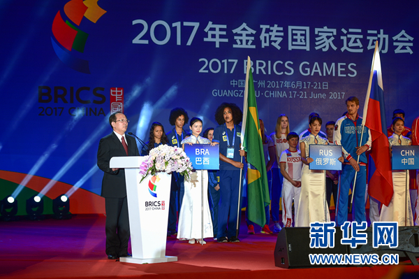 6月17日,2017年金磚國家運動會在廣州開幕,國家主席習近平致賀信,對運動會的召開表示熱烈祝賀,向參加運動會的各國嘉賓、運動員、教練員們致以誠摯的歡迎。國家體育總局局長茍仲文在開幕式上宣讀了習近平主席的賀信。新華社記者 劉大偉 攝