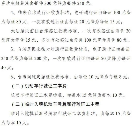《通知》規定,自2017年7月1日起,降低電信網碼號資源占用費、頻率占用費、公民出入境證件費、機動車行駛證工本費、臨時入境機動車號牌和行駛證工本費、水土保持補償費、農藥實(試)驗費、集成電路布圖設計保護費等收費標準。