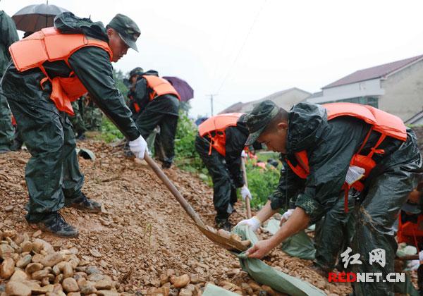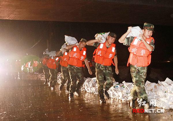 1日下午15時30分,長春垸新橋河鎮烈公橋段河堤又密集出現十二處小管涌,救災官兵來不及洗去臉上的泥土,又投入到緊張的救援工作中,兩個小時候,十余處險情全部被排除。6月30日下午18時,暴雨侵襲下的湘西沅江水位持續上漲,瀘溪縣境內浦市至武溪段全面超警。武警湘西支隊115名官兵連夜奮戰在一線,全力抗擊洪峰。在武溪鎮五里洲村,截至目前,該支隊共疏散、轉移群眾1000余人,排查化解各類安全隱患6起,裝填沙袋2000多袋,打好木樁500余個,幫助轉移財產物資50余萬元。1日凌晨5時,洪水漫灌懷化辰溪縣城,城區到處一片汪洋,全域進入防汛1級應急響應。懷化支隊50余名救援官兵迅速馳援,利用自帶皮劃艇和征用民用木船等手段,深入老城區中心轉移受困群眾800余人。救援中,一名高燒兩天多的4歲女孩被困3樓家中,該支隊參謀長王良華帶一艘皮劃艇避開縱橫交錯的架空電線,成功將其轉移至附近醫院。