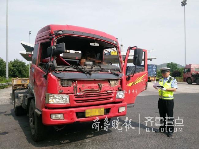 不一會兒,民警便發現這輛非同尋常的貨車,并將其引導下收費站接受檢查。一看,這輛車問題還真不少,除了沒有前擋風玻璃,車頭前部保險杠和大燈都被撞的不成樣子。原來該車在濰坊某地遇追尾事故,因事故案發地人生地不熟,便聯系了一家濟寧本地的汽修廠。事故處理完畢后,該車駕駛員不顧辦案民警勸阻,徑自將無擋風玻璃的事故車開上了高速。