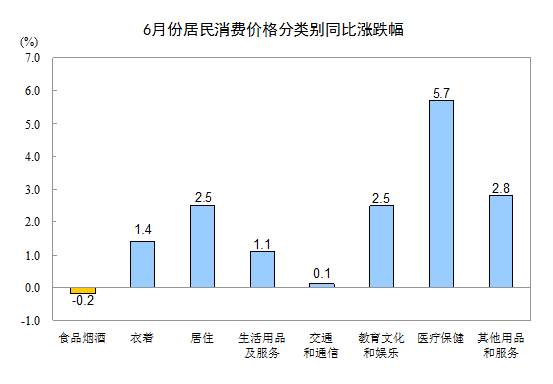 6月份,其他七大類價格同比均有所上漲。其中,醫(yī)療保健價格上漲5.7%,其他用品和服務(wù)價格上漲2.8%,居住、教育文化和娛樂價格均上漲2.5%,衣著、生活用品及服務(wù)、交通和通信價格分別上漲1.4%、1.1%和0.1%。
