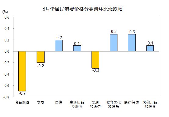 6月份,全國居民消費(fèi)價格環(huán)比下降0.2%。其中,城市下降0.1%,農(nóng)村下降0.2%;食品價格下降1.0%,非食品價格上漲0.1%;消費(fèi)品價格下降0.4%,服務(wù)價格上漲0.3%。